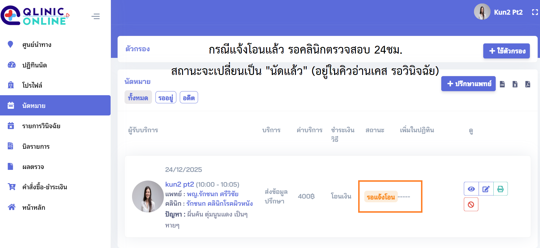 1. รอตรวจสอบ: หลังผู้รับแจ้งโอนเงินแล้ว รอให้คลินิกตรวจสอบยอดตามรอบเวลา