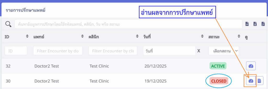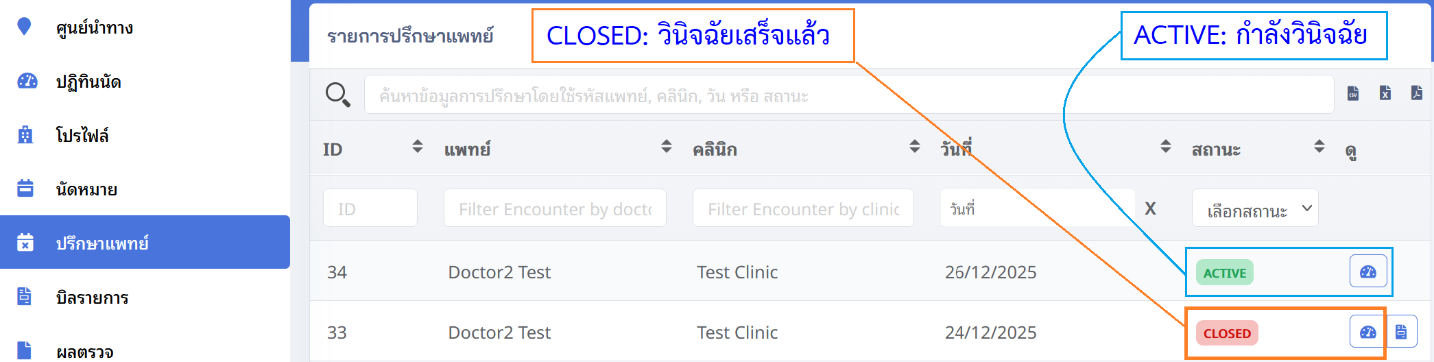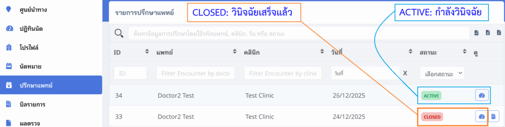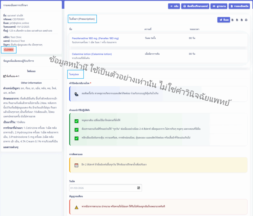 13. เมื่อแพทย์วินิจฉัย และให้บันทึกข้อมูลการรักษาเรียบร้อยแล้ว สถานะจะเปลี่ยนเป็น ปิด, ซึ่งผู้รับบริการสามารถเปิดดูข้อมูลต่างๆ เช่น การวินิจฉัย การรักษา และคำแนะนำอื่นๆ