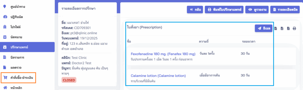 กรณีที่ต้องรักษาด้วยยา จะพบว่ามีรายการใบสั่งยาเกิดขึ้นในหน้าวินิจฉัย ผู้รับบริการสามารถนำใบสั่งยาไปซื้อยาที่ร้านขายยาใกล้บ้าน หรือหากต้องการรับยาโดยตรงจากคลินิก ให้ทำการโอนเงินค่ายาเข้าคลินิกโดยตรง ไปที่เมนู “คำสั่งซื้อ-ชำระเงิน” ทำการชำระเงิน, ยืนยันที่อยู่จัดส่ง, และ แจ้งการโอนเงินตามลำดับ