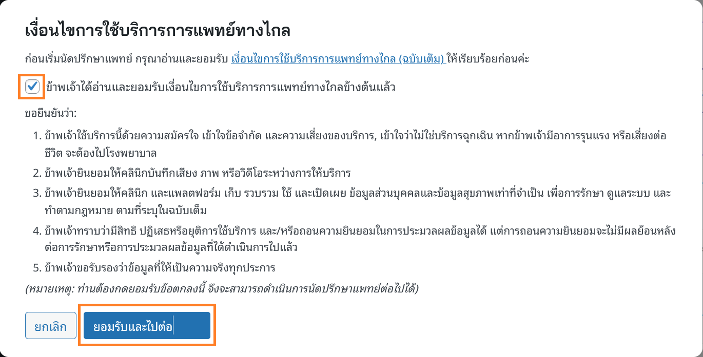 จะมีกล่องข้อความแจ้ง ให้อ่านเงื่อนไขการใช้บริการการแพทย์ทางไกล ต้องติ๊กยอมรับก่อนจึงจะสามารถทำรายการต่อไปได้ (เนื่องจากการตรวจรักษาออนไลน์มีข้อจำกัดไม่เหมือนการตรวจในคลินิก ดังนั้นผู้รับบริการจำเป็นต้องรับทราบและยอมรับบริการประเภทนี้ก่อน)