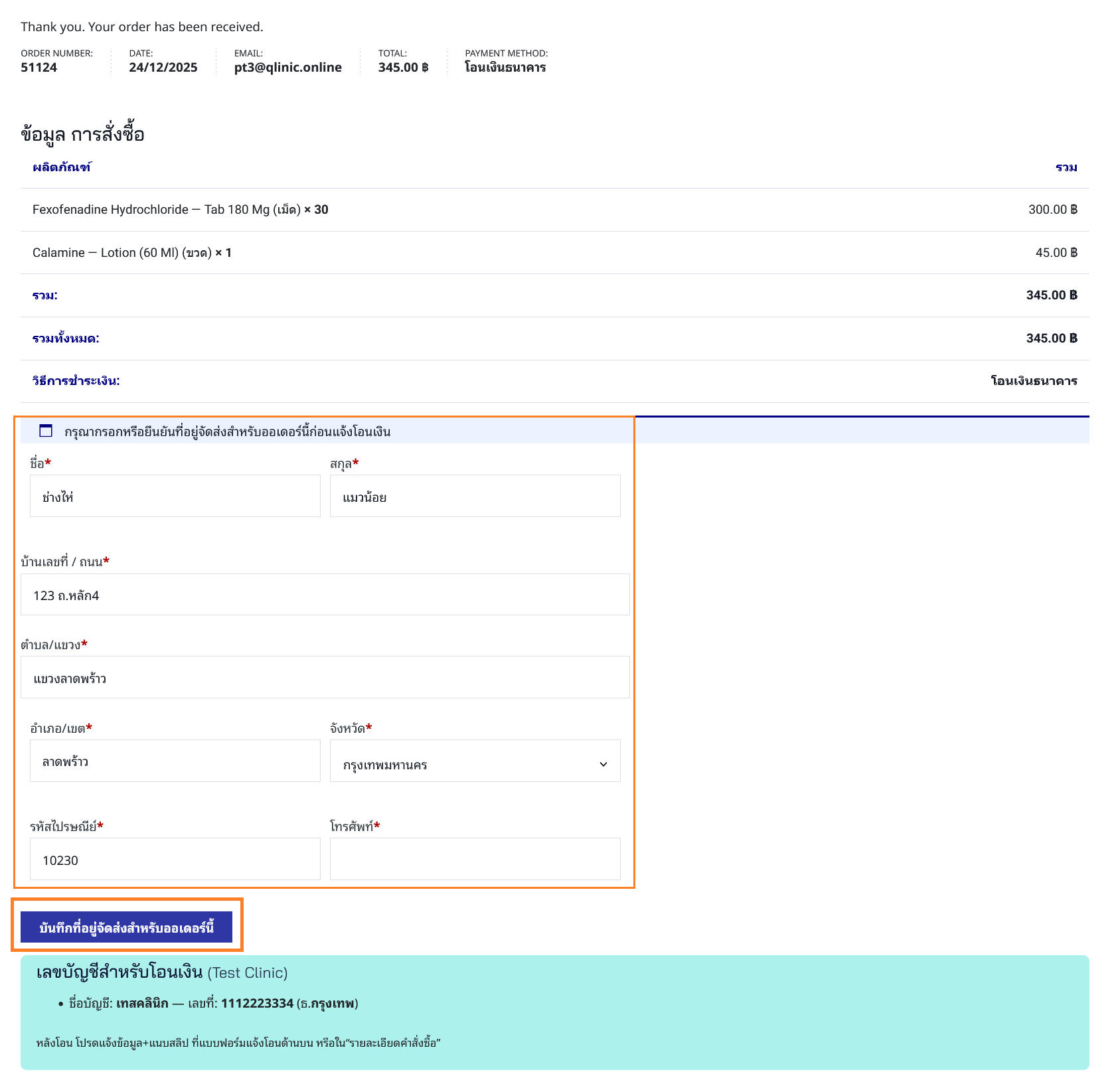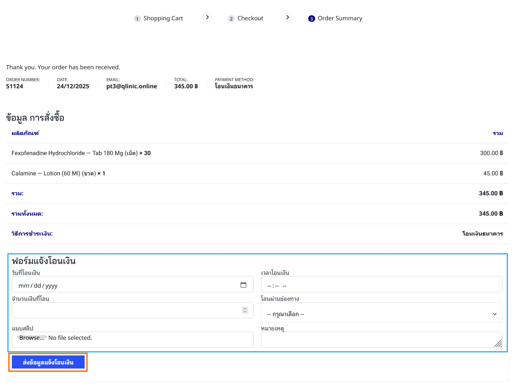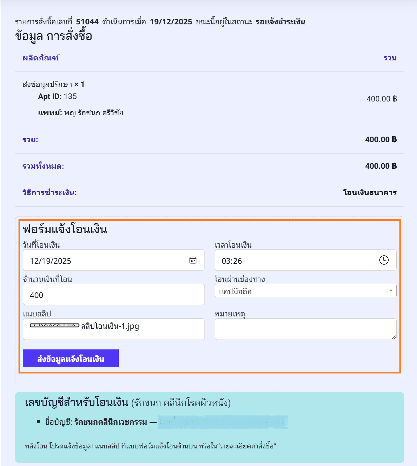 16. ทำการแจ้งโอนเงินในแบบฟอร์ม พร้อมแนบสลิปโอน, กดปุ่มแจ้งโอน จะพบสถานะคำสั่งซื้อ เปลี่ยนแปลงไปตามกิจกรรมที่คลินิกดำเนินการ ดังนี้
