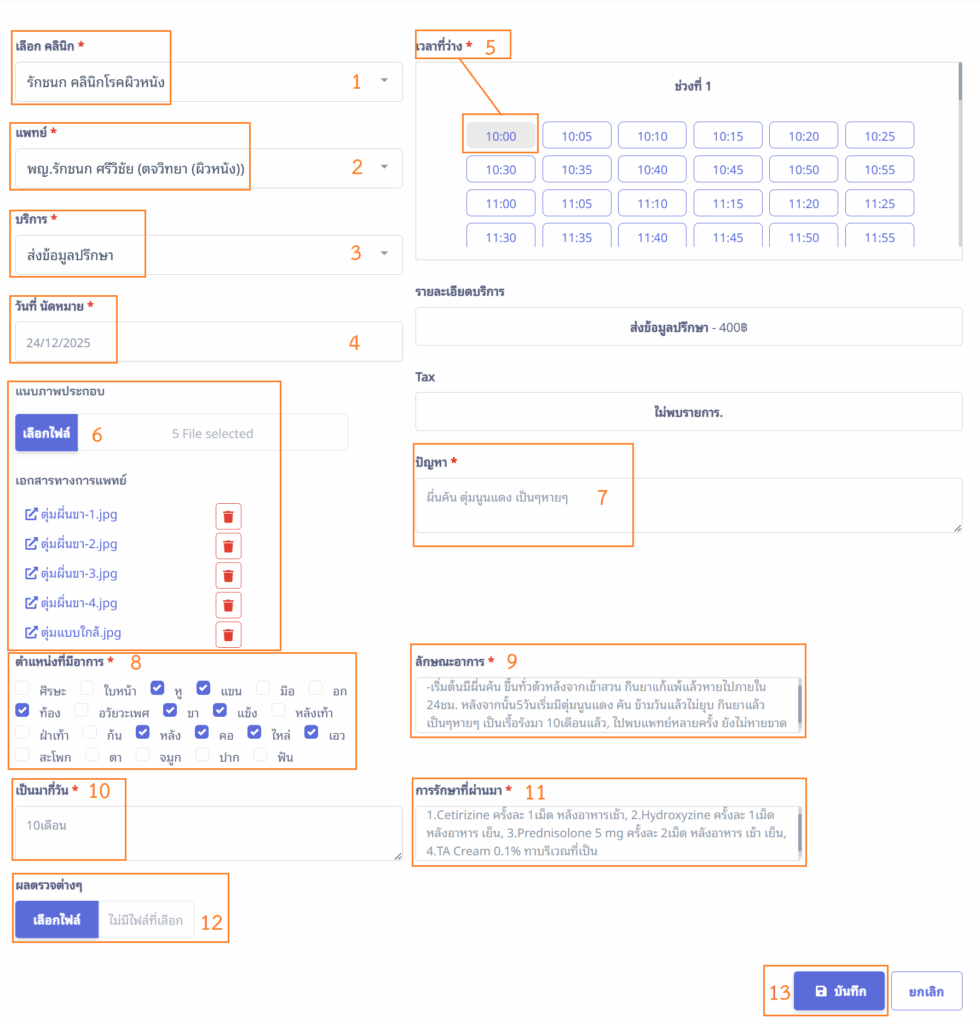 ให้ข้อมูลที่จำเป็น เช่น อาการ ประวัติ การแพ้ การใช้ยา รวมถึงภาพประกอบรอยโรค