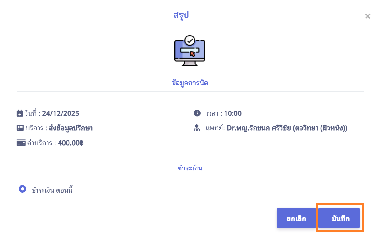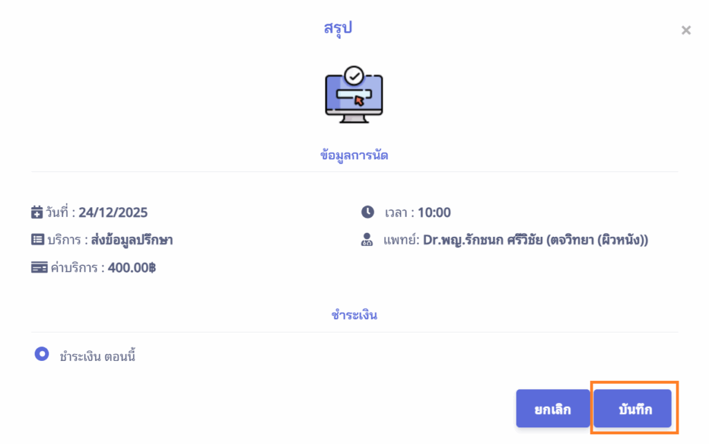 7. ตรวจสอบข้อมูลสรุปการนัด กดปุ่ม ยืนยัน เพื่อไปชำระเงิน