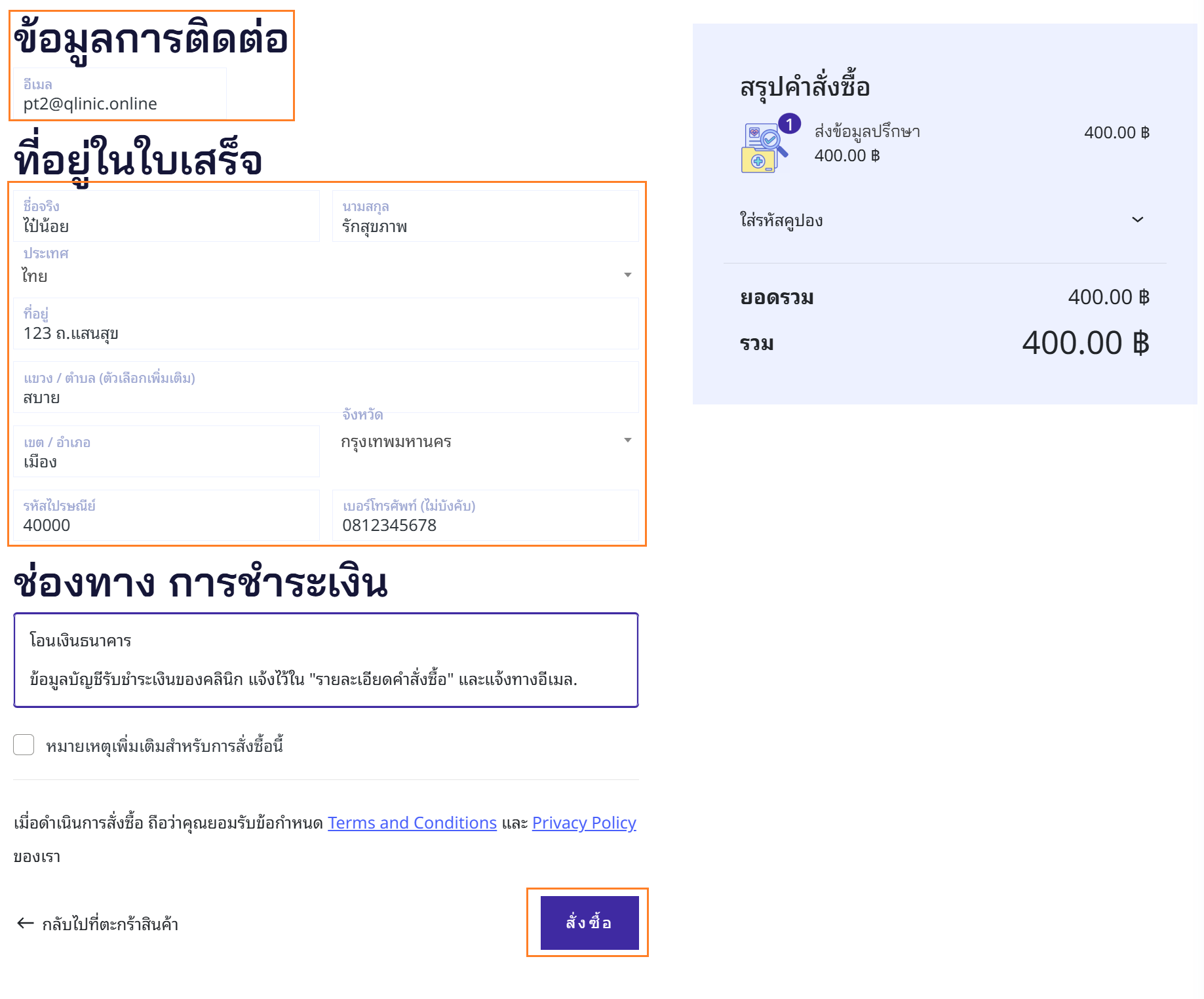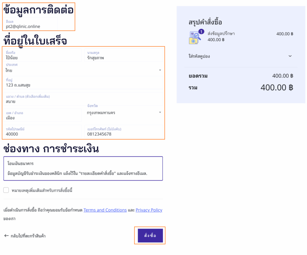 8. กรอกชื่อที่อยู่ทางไปรษณีย์, กดปุ่ม สั่งซื้อ