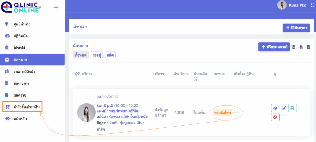 2. กรณีต้องการรับยาจากคลินิก ให้คลินิกส่งยาถึงบ้าน, ให้ดำเนินการชำระเงิน โดยไปที่เมนู คำสั่งซื้อ-ชำระเงิน