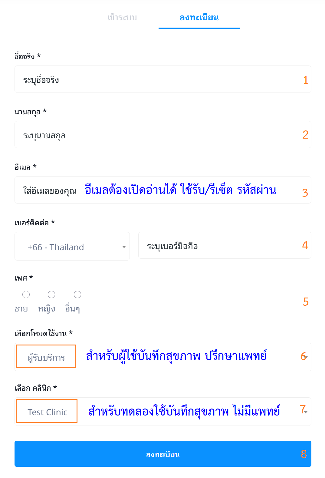 - กรอกข้อมูลในแบบฟอร์มทุกข้อ, จากนั้นกดปุ่ม ลงทะเบียน